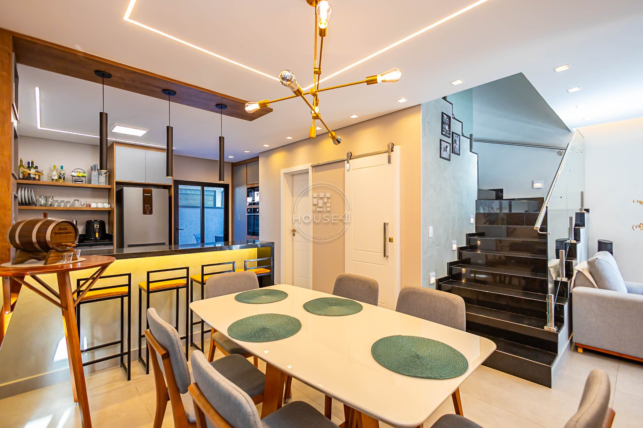 Com 223 m² privativos, a residência apresenta um projeto inteligente, moderno e acolhedor, com ambientes integrados que valorizam a convivência familiar. A área social conecta sala, cozinha e espaço gourmet, criando um ambiente amplo e convidativo.